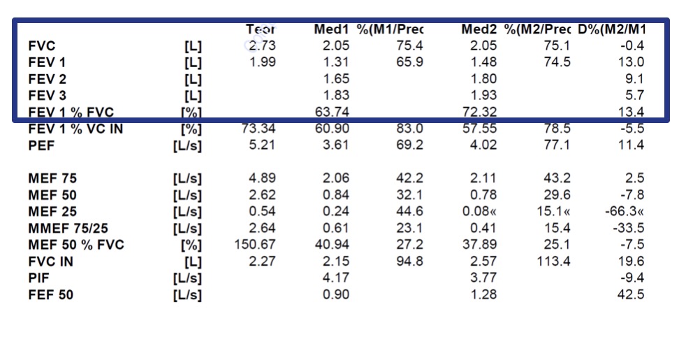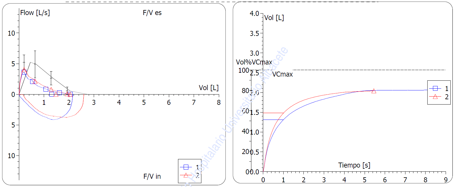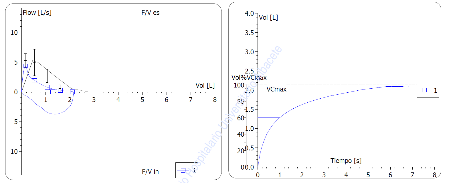 - En Neumología se realiza una espirometría con prueba broncodilatadora, que demuestra una obstrucción ventilatoria con FEV1 del 55 % y prueba broncodilatadora con incremento del FEV1 de un 8 % (FEV1 posBD 60%).