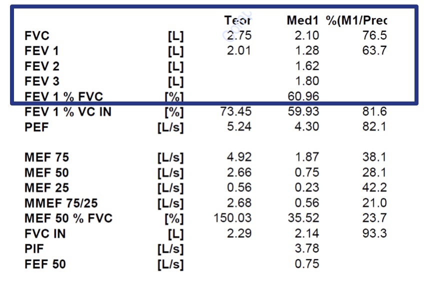 - Pruebas funcionales respiratorias completas con su tratamiento pautado (prueba posbroncodilatadora (PBD)): FVC 2420 (91%), FEV1 1260 (65%), FEV1/FVC 52%, MMEF 290, PEF 4030 (78%). DLCO 4170 (65%), KCO 1110 (71%). RV 4100 (238%), TLC 6110 (148%) y RV/TLC 166%.